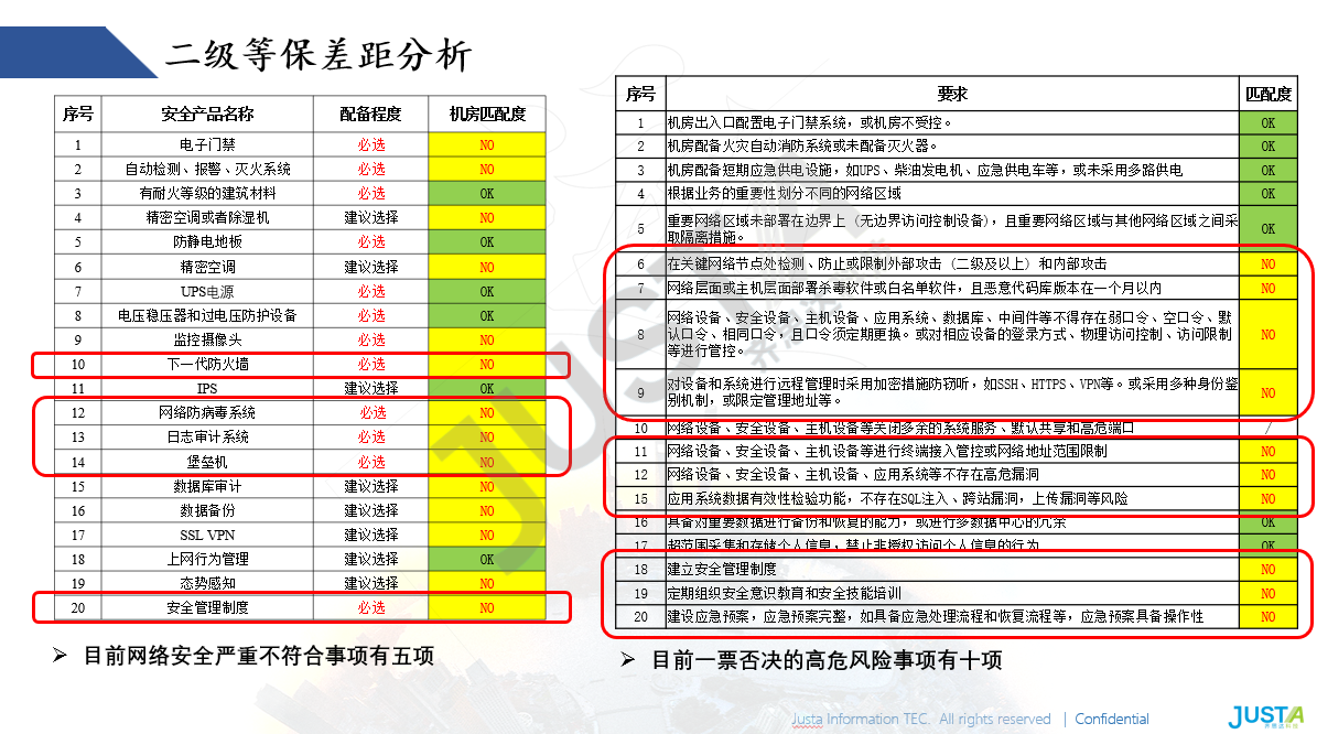通(tōng)過等保二級差距分(fēn)析,發現(xiàn)盈科(kē)電(diàn)子(zǐ)網絡安全建設存在多(duō)項嚴重不(bù)符合事(shì)項和(hé)高(gāo)危風(fēng)險事(shì)項,如(rúδ)高(gāo)級威脅檢測能(néng)力不(bù)足、核心業(yè)務容災能(néng)力不(bù)足等。這(zhè)些(xiē)問(wèn)題如(rú)不(bù)解決,将導緻盈科(kē)電(diàn)子(zǐ)無法通(↕tōng)過數(shù)字化(huà)工(gōng)廠(chǎng)的(de)安全評級,無法獲取補貼,同時(shí)業(yè)務應用(yòng)面臨嚴重的(de)網絡安全威脅。